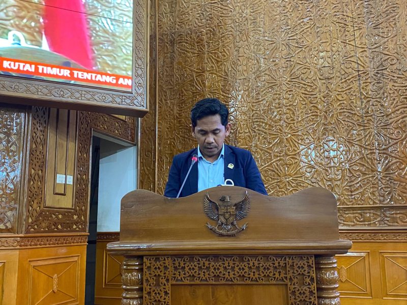 KUTAI TIMUR – Legislator Yusri Yusuf, mewakili Fraksi Partai Demokrat Dewan Perwakilan Rakyat Daerah (DPRD) Kabupaten Kutai Timur (Kutim) dalam menyampaikan pandangan pada Rapat Paripurna ke-22 DPRD Kutim.